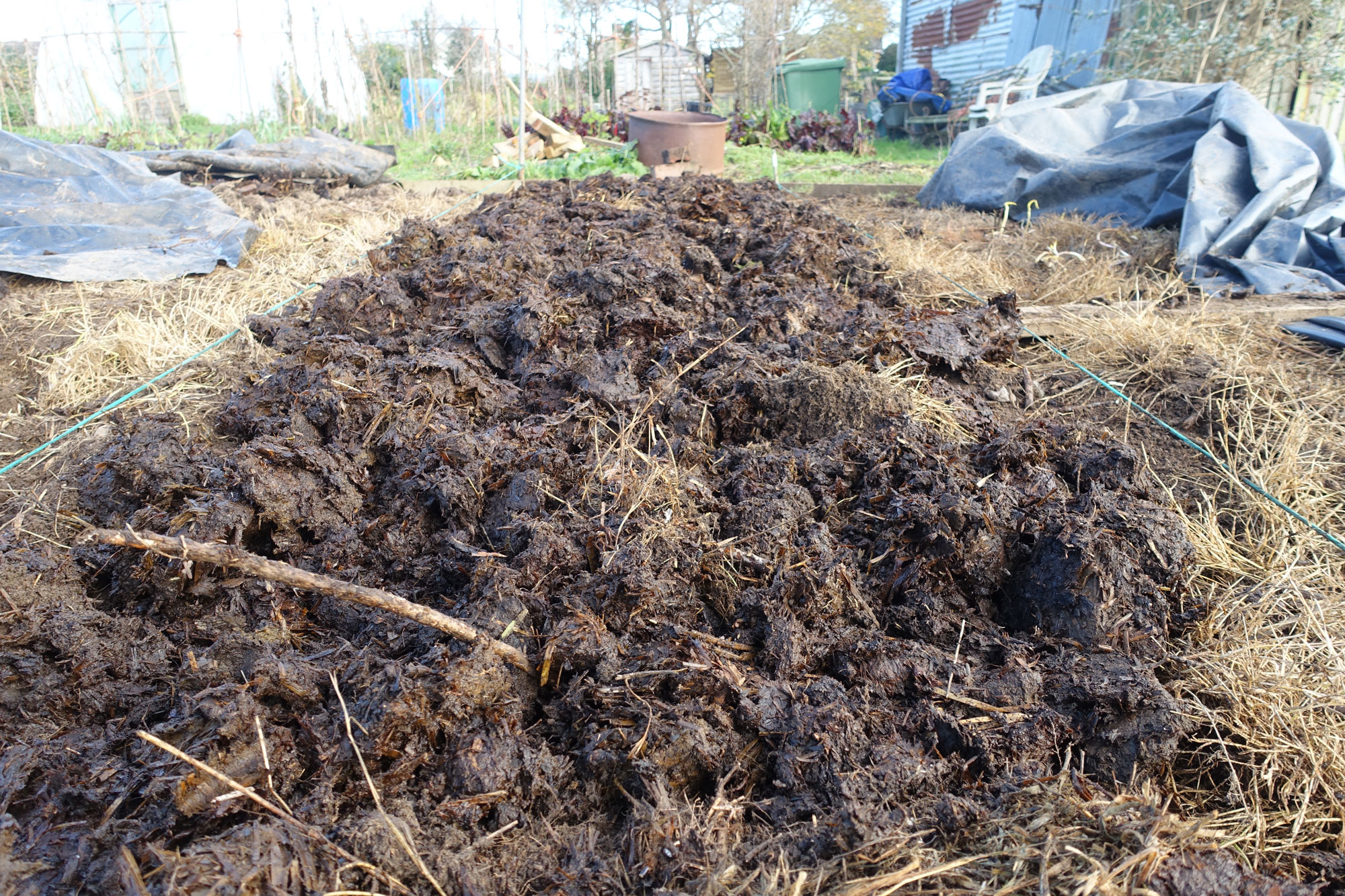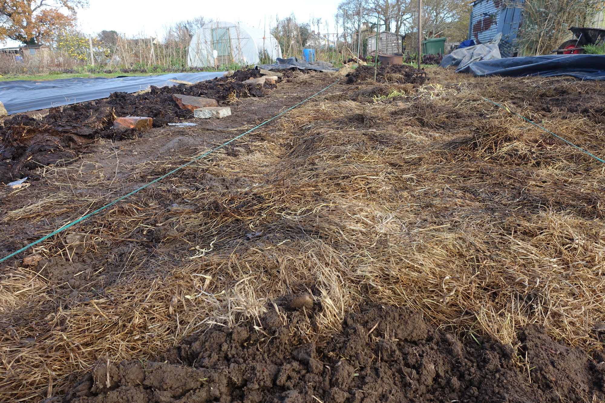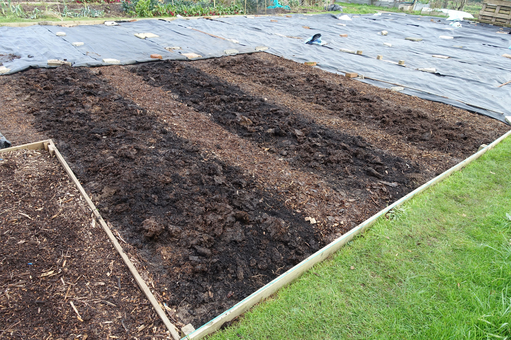 November 2019: muck from Bruce added to 1.2m wide beds; 0.6m wide paths left bare with woodchip added later. Recovered with plastic.